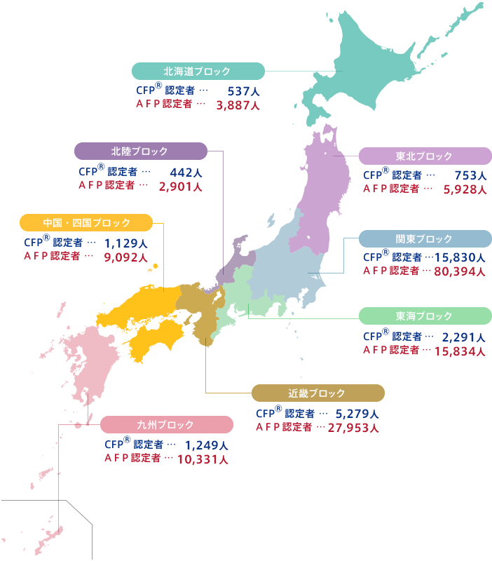 CFP®・AFP認定者は日本全国で活躍しています。全国8つのブロックごとに所属するCFP®・AFP認定者の人数は以下のとおりです。