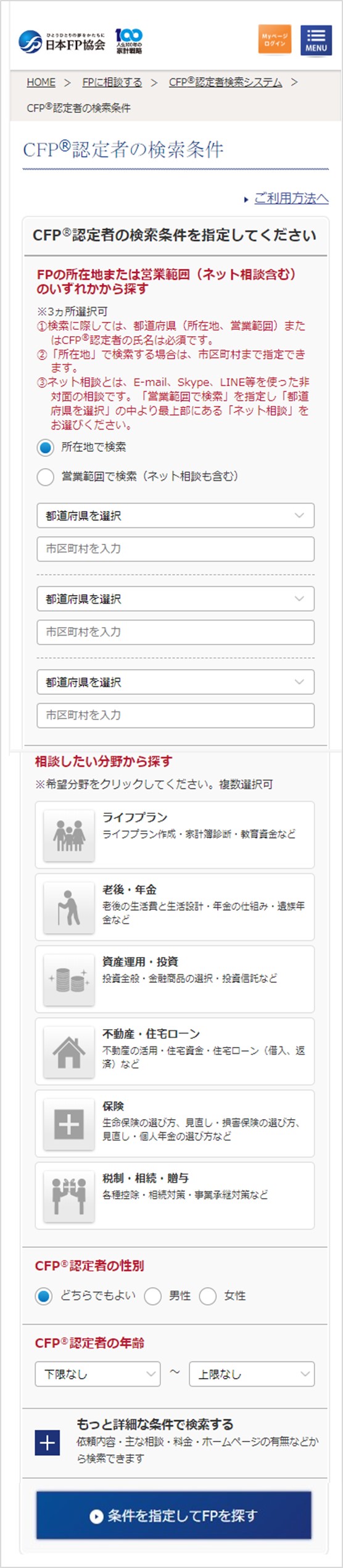 CFP®認定者をお住まいの地域や相談したい内容から検索できます。