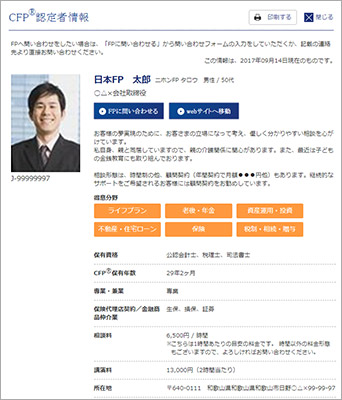 CFP®認定者検索システムは、CFP®認定者(ファイナンシャル・プランナー)自身により登録申請された情報を掲載しています。当サービスはCFP®認定者へのFP相談や講演、執筆等の業務を依頼する際にご利用いただくことを目的としています。これらと異なる目的でのご利用はできませんのでご了承ください。特に、商用目的でのご利用は固くお断りいたします。なお、CFP®認定者への問い合わせやFP相談・講演依頼等の契約は、利用者とCFP®認定者間で行われるものであり、当協会はその内容等について責任を負う立場にありません。