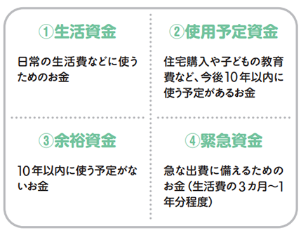 手持ちのお金には、すでに使い道が決まっているものと、そうでないものがあるでしょう。それぞれに合った管理をするためにも、まずはお金を①日常の生活に必要な「生活資金」、②今後10年以内に使う予定が決まっている「使用予定資金」、③今後10年以内に使う予定がない「余裕資金」、④急な出費に備えるための「緊急資金」の4つに分けてみましよう。この中で①生活資金、②使用予定資金、④緊急資金は減らすことができない守るお金。また、10年以内に使う予定がない③余裕資金は、投資などに回すことも考えられる、増やすお金といえます。