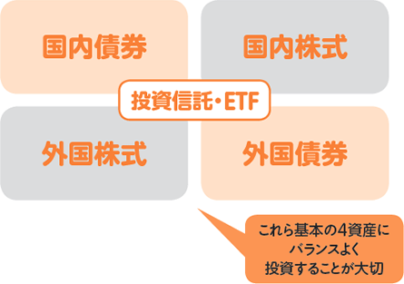 基本となる投資対象には「国内債券」、「国内株式」、「外国債券」、「外国株式」の4つがあります。投資先の分散をはかり、安定的な運用成績を目指すためには、この4資産にバランスよく投資することが重要です。これらの資産に投資する投資商品で初心者でも利用しやすいのは「投資信託」や「ETF(上場投資信託)」でしょう。