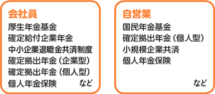 また、自営業の人が年金を増やすなら、国民年金に上乗せできる国民年金基金や確定拠出年金(個人型)、退職金を増やす「小規模企業共済」などを利用することができます。このほか、民間の個人年金保険を利用して老後資金を増やす方法もあります。