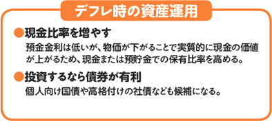 デフレのときはお金の価値が上がる一方で、株式や不動産などの価格は下がるのが一般的です。このため預貯金など現金部分の比率を高めるのが運用の基本といえます。また、インフレのときはお金の価値が下がり、株式や不動産の価格は上がる傾向があります。このため、デフレ時と同じ運用方法では、物価上昇に負けてしまう可能性もあるので、インフレ時は物価上昇に負けないために株式や不動産、金、外貨など複数の資産に分散投資し、資産全体で運用利回りを上げることが大切です。