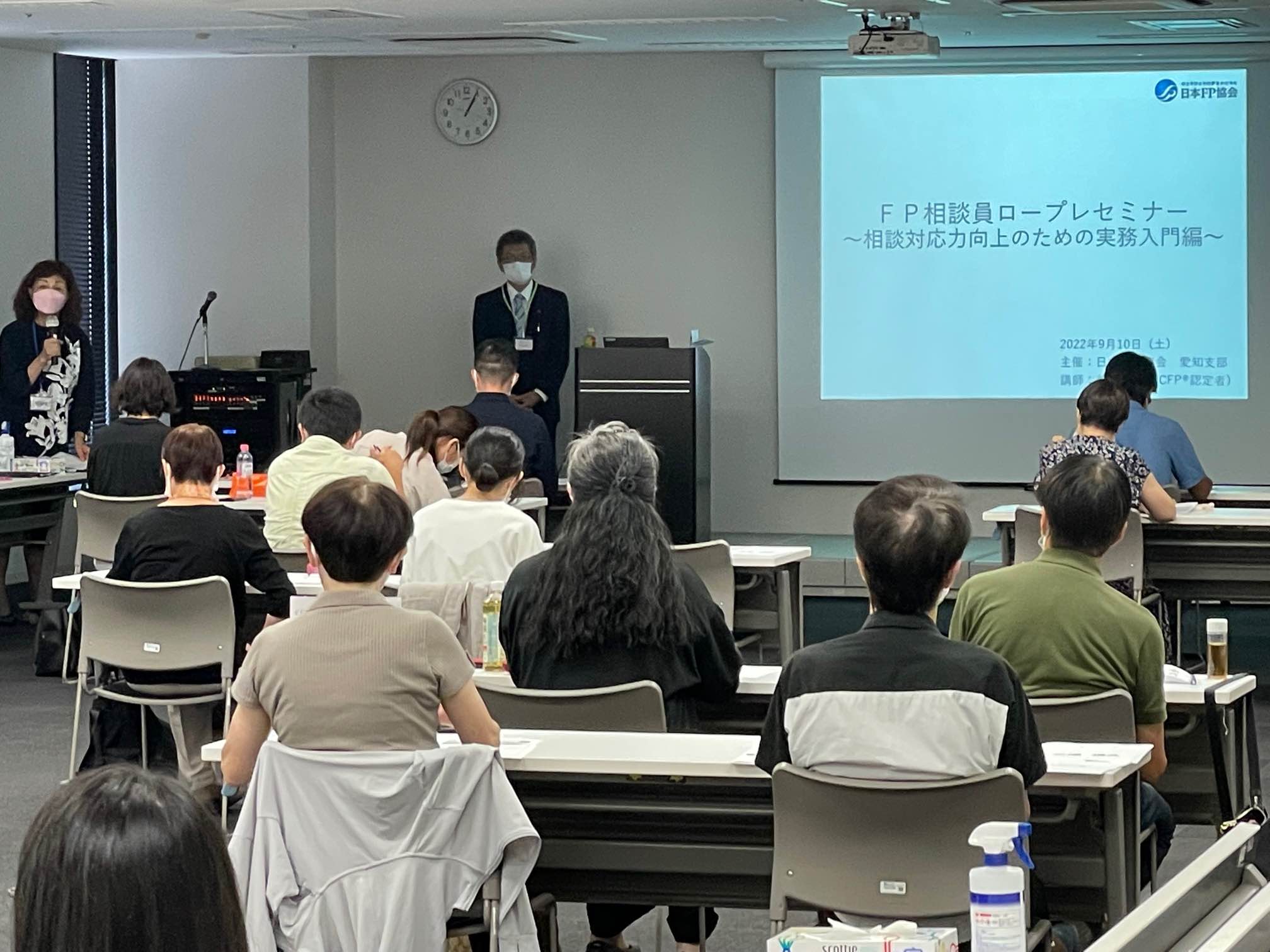 相談業務をする際の基礎として、前半は前田講師による座学、後半は4つの事例をもとに相談員と相談者を順番に体験する実務ロールプレイングを実施しました。中間にスタッフによる模擬相談をはさみ、実際の相談会の雰囲気を感じてもらいました。午前中に開催されていた相談員研修会に参加された方の約半数が午後からのロールプレイング研修にも参加して下さいました。3年ぶりの開催を待ち望んだ参加者も多く、参加者同士で話し合ったりスタッフからのアドバイスも取り入れつつ、参加者の皆様がそれぞれの役割になりきり、活気ある研修会となりました。今回の研修を受けて11月のFPフェアに相談員として応募して下さることを期待しています。
