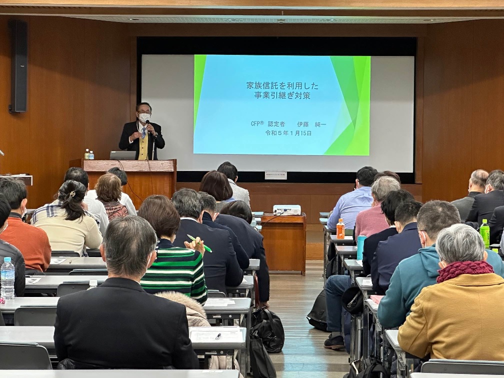 中小企業診断士、行政書士でもあり、事業承継に造詣が深い伊藤純一氏にご講義いただきました。民事信託というと相続の話が多いですが、伊藤氏は、会社の事業承継という視点で捉えたということが興味深い点でした。民事信託は、遺言書では不可能である二次相続以降の財産の行方も決められるため、会社経営において二代先の会社承継者も定めることができることなど、応用の利く制度であることが理解できました。また、現経営者から後継者に株式を譲渡しつつ、後継者から現経営者に対し株式信託を受けることによって、段階的な経営権の委譲を行うなど、様々な事業承継の事例に対応できる制度であると感じました。 もっとも、民事信託は、法律関係や相続税制と大きくかかわる分野であるため、弁護士法、税理士法違反にならないように、FPは、コーディネーターとしての役割で、専門家と連携していく必要があるとの注意点も示されていました。 講座の終わりには質疑応答もあり、民事信託に関する受講者の関心の高まりを感じました。