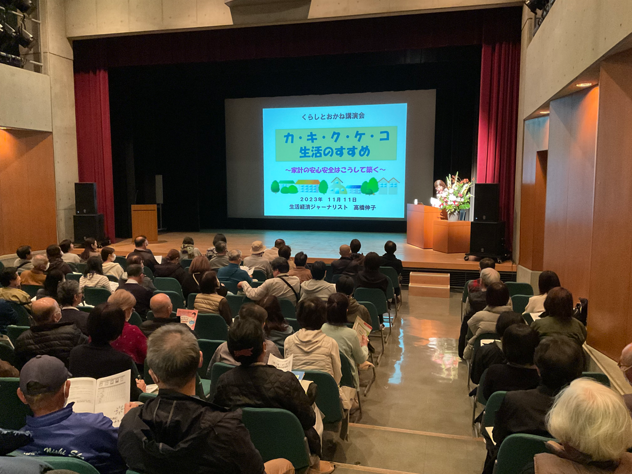 くらしとおかね講演会では「カ・キ・ク・ケ・コ生活のすすめ〜家計の安心安全はこうして築く〜」と題し、生活経済ジャーナリストの高橋伸子氏に家計管理のポイントについてご講義いただきました。