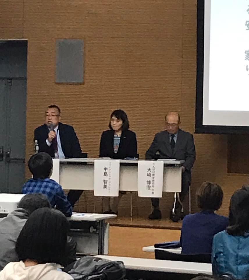 パネラーは第一部でも講師を務められた中島智美さん たんぽぽ教育研究所で、元・高知県教育長の大﨑博澄さん 高知支部の石川智さんです。