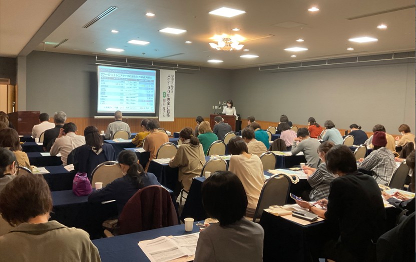 メインセミナーに先立ち、地元FPの川口厚子氏によるワークショップ型セミナーを開催し、「50歳から始める人生100年の家計戦略」をテーマに、シニアライフの支出や収入を確認しながら将来の家計を予測する方法について説明されました。