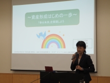 資産形成はじめの一歩〜幸せ未来を実現しよう〜をテーマにライフスタイルの多様化から参加者各自の「幸せ未来」とは何なのか?を提起し、その実現のためにはライフプラン表やキャッシュフロー表を有効活用することについて講演。お金の使い方を考えることは生き方を考えること。時代の変化が激しく、価値観も多様化している現在、 自分だけの「幸せ未来」を考えることも重要。 ライフプランを作成して、ライフイベントに必要な金額を把握すること。必要なお金は、社会保険や公的制度、会社の制度も十分活用して。 投資は必ずしも必要ではないが、少子高齢化・インフレへの理解、対策をとること。 投資をするなら「長期・分散・積立」ができるNISAや目的に応じて使い分けようといった内容で実施しました。