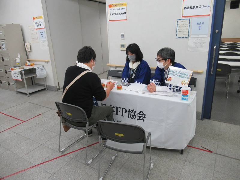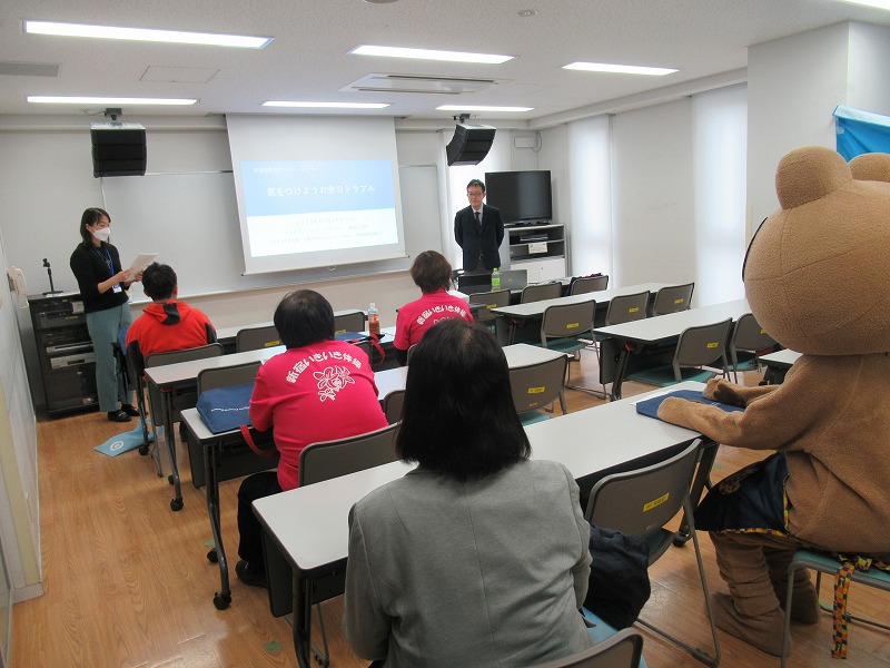 5階会場ではセミナーとクイズを2回ずつ実施、約30人の生活者が集まりました。セミナーは「気をつけよう!お金のトラブル」と題して、CFP🄬認定者の歌代将也氏がクレジットカードの注意点や、最近の消費者トラブルの手口、万一消費者トラブルに遭ってしまった場合の対処法などについて、具体例も交えながら説明しました。途中、ゆるキャラの「ふらっと君」が座って耳を傾ける一幕もあり、生活者の関心の高さが感じられました。