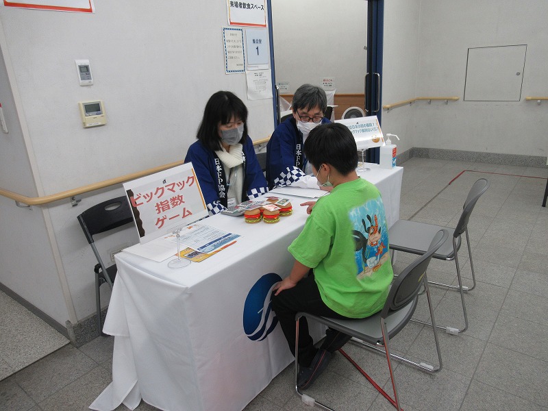 地下1階ロビーの団体情報ブースには、老若男女を問わず40名ほどが来場しました。その全員が、日本を含む5ヵ国のビックマック価格を想像して並べ替える「ビックマック指数ゲーム」に挑戦しました。楽しみながら世界の物価水準と為替レートの影響について知る機会になりました。他にも、5問からなる「お金のクイズ」を多くの方が解き、お金の知識を身につけて帰られました。