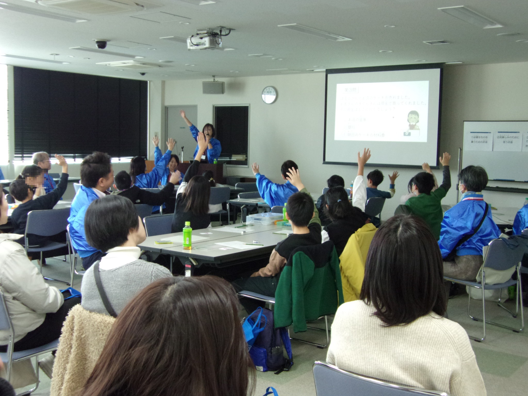 内容は、全員で「お金クイズ」と「お金の使い方」を体験した後に、お子様は「おこづかいゲーム」を、保護者の方は「ライフプランゲーム」を楽しんでいただきました。