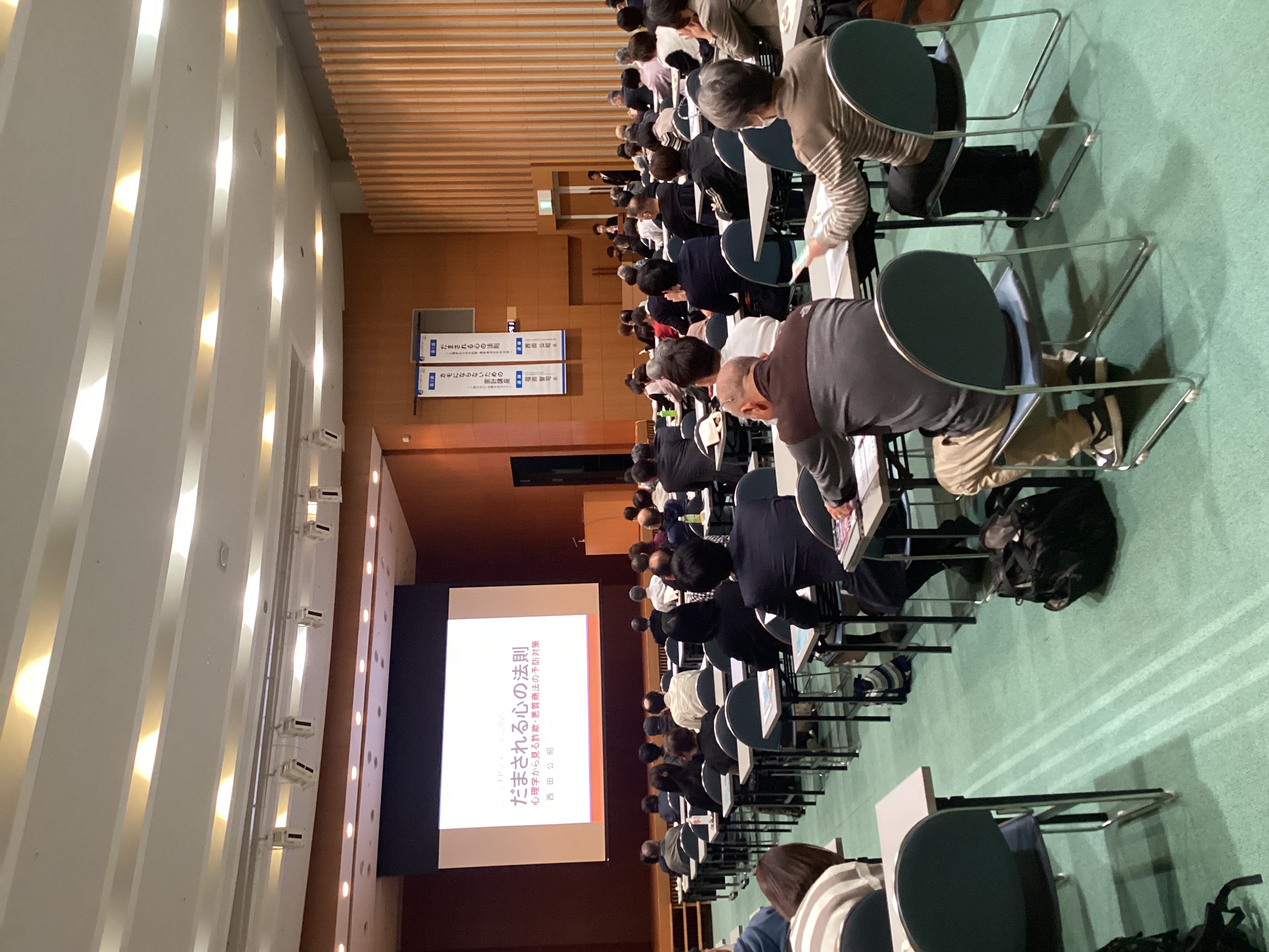 第1部セミナーでは、西田公昭氏を講師にお迎えし、「だまされる心の法則〜心理学からみる詐欺・悪質商法の予防対策〜」と題し、自身の資産を守るため、詐欺・悪質商法の手口を知り、怪しい勧誘に気づくための訓練が大切だとお話いただきました。